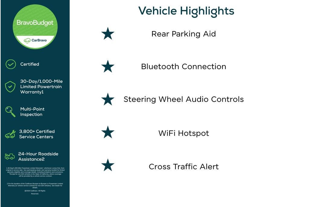 Certification Program Details: BravoBudget Certification 30-Day/1,000- mile limited powertrain warranty 24-Hour Roadside assistance** *30-day/1,000-mile Powertrain Limited Warranty*, whichever comes first, from original in-service date. See participating dealer and warranty booklet for limited warranty eligibility and coverage details, including limitations and exclusions. *Except for non-GM vehicles in the State of California, where coverage will be provided by a vehicle service contract. **For the duration of the CarBravo Bumper-to-Bumper or Powertrain Limited Warranty (or vehicle service contract for non-GM vehicles). See dealer for details. Awards: