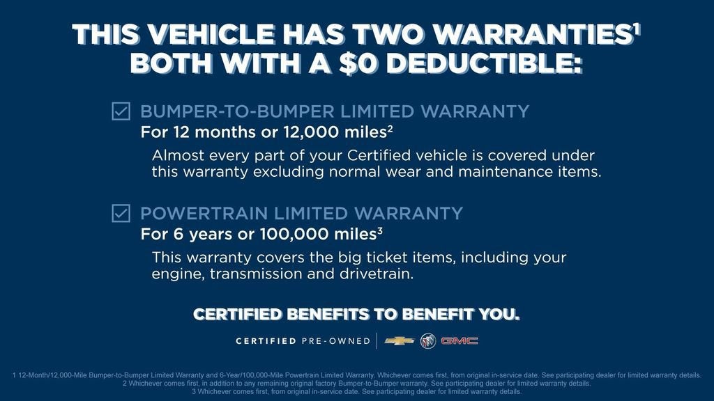 Certification Program Details: CarBravo Standard Certified 12-month/12,000 mile limited warranty * 24 hour roadside assistance** *12-Month/12,000-Mile Bumper-to-Bumper Limited Warranty**, whichever comes first, in addition to any remaining original factory Bumper-to-Bumper warranty. See participating dealer and warranty booklet for limited warranty eligibility and coverage details, including limitations and exclusions. **Except for non-GM vehicles in California, where coverage will be provided by a separate vehicle service contract. **For the duration of the CarBravo Bumper-to-Bumper or Powertrain Limited Warranty (or vehicle service contract for non-GM vehicles). See dealer for details.