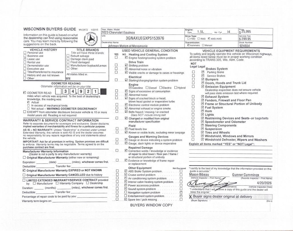Price does not include sales tax, title, registration, or $299.95 service fee.