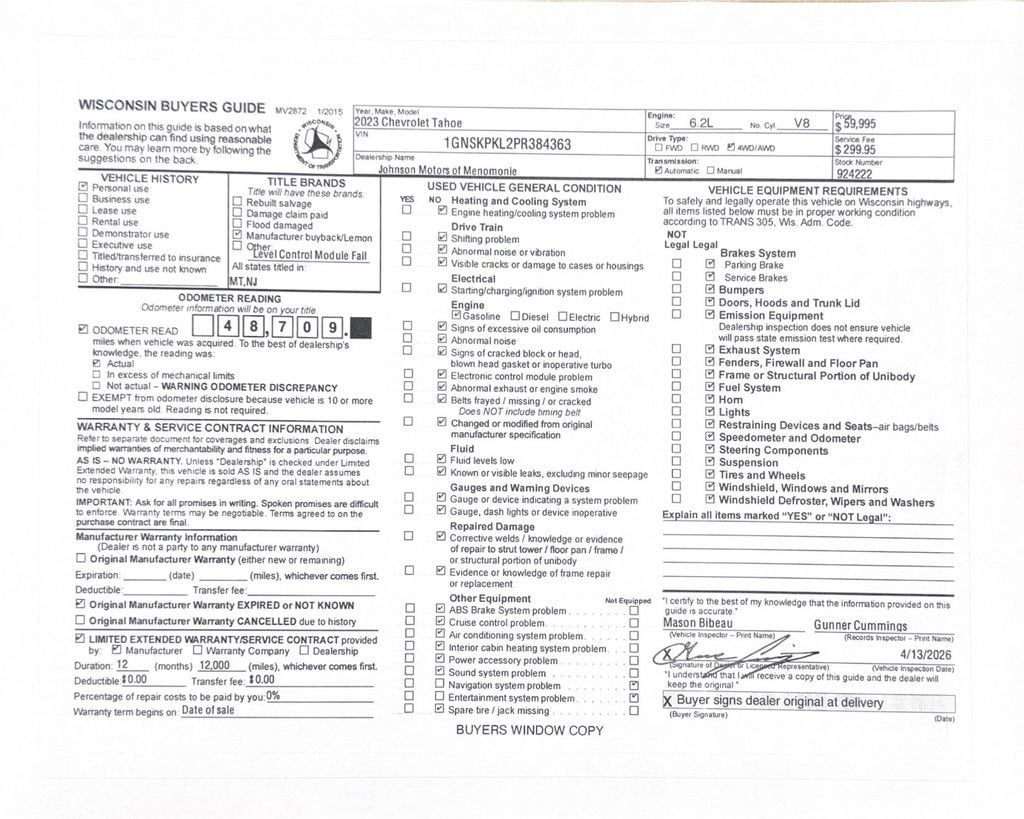 Price does not include sales tax, title, registration, or $299.95 service fee.