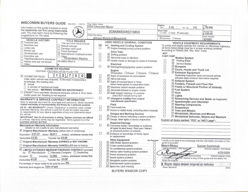 Price does not include sales tax, title, registration, or $299.95 service fee.