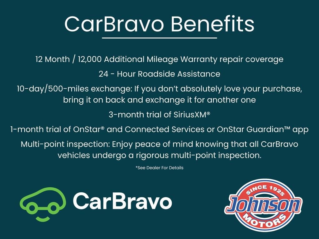 Certification Program Details: 12-month/12,000 mile limited warranty * 24 hour roadside assistance** *12-Month/12,000-Mile Bumper-to-Bumper Limited Warranty**, whichever comes first, in addition to any remaining original factory Bumper-to-Bumper warranty. See participating dealer and warranty booklet for limited warranty eligibility and coverage details, including limitations and exclusions. **Except for non-GM vehicles in California, where coverage will be provided by a separate vehicle service contract. **For the duration of the CarBravo Bumper-to-Bumper or Powertrain Limited Warranty (or vehicle service contract for non-GM vehicles). See dealer for details.